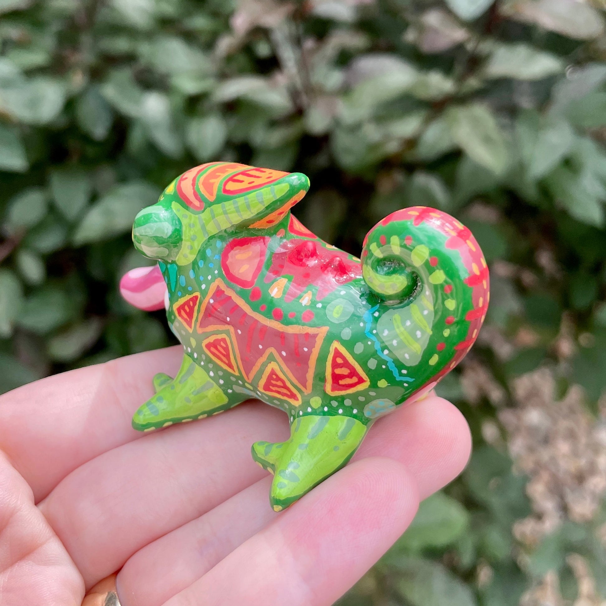 Looking to brighten up your space? This lively, vibrant chameleon is just what you need! Hand-painted with fun, abstract patterns, he brings a splash of color and personality wherever he goes.